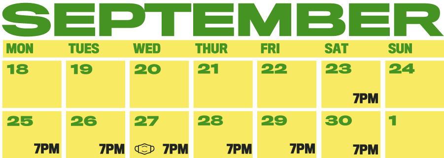 Saturday, September 23 – Sunday October 28, Monday – Saturday @ 7PM with additional performances on Saturday @ 2PM beginning October 14. Click the “calendar” tab to view our full performance schedule.