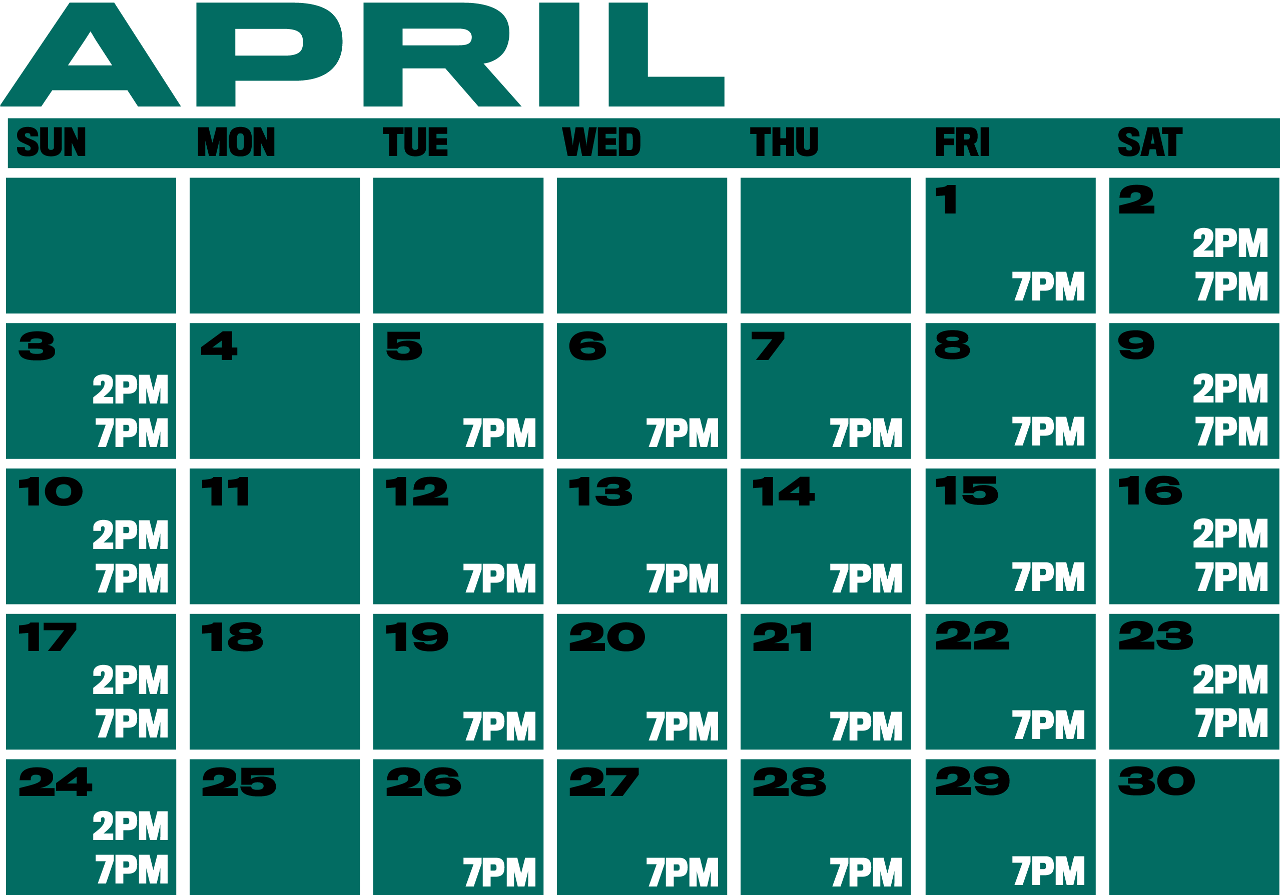 Performances take place Tuesday–Saturday at 7pm with additional performances on Saturday and Sunday at 2pm starting March 26 and two 5pm performances on March 20 and 27. Click the “calendar” tab to view our performance dates.