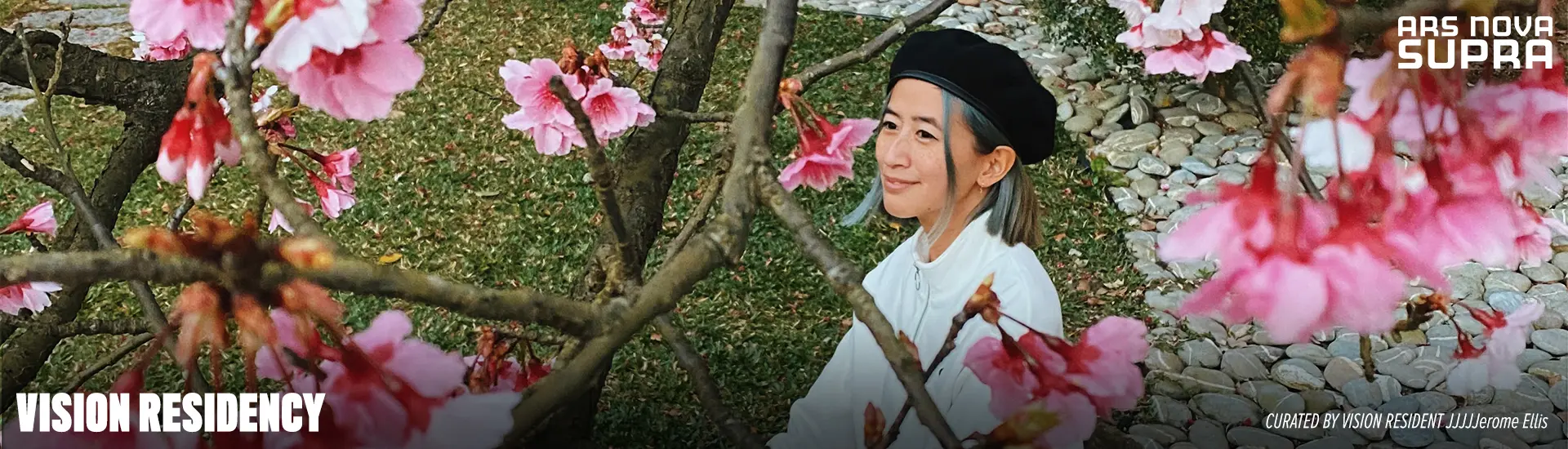 Photo description: A Taiwanese-American woman, Yo-Yo Lin 林友友, sits on a grass lawn, with a path of smooth grey stones behind her. She is wearing a black beret and a white zip-up sweater. Her hands rest on her knees. In the foreground, almost obscuring Yo-Yo, are the branches and blooms of a cherry blossom tree.